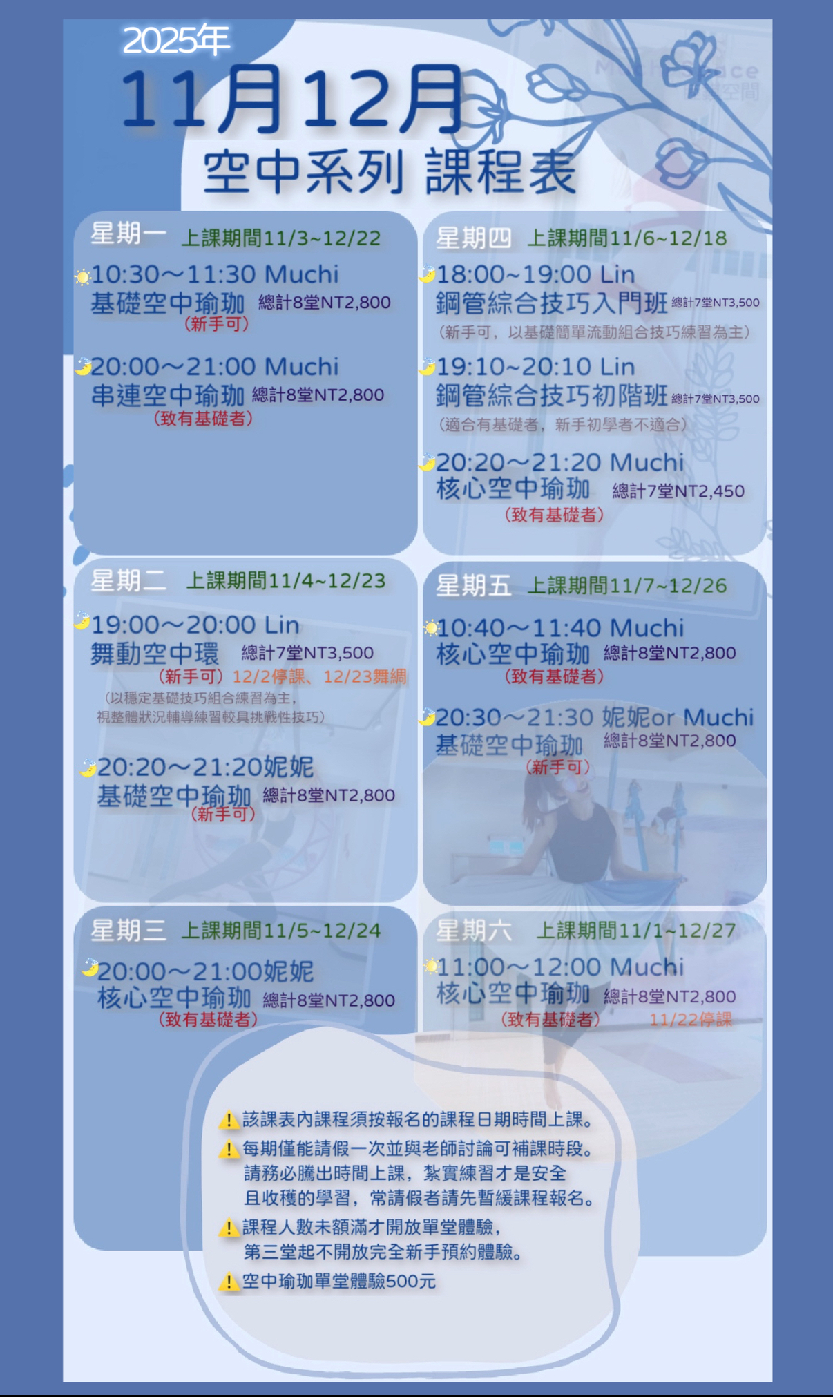 上半段藍色課表為11月12月空中系列團課表